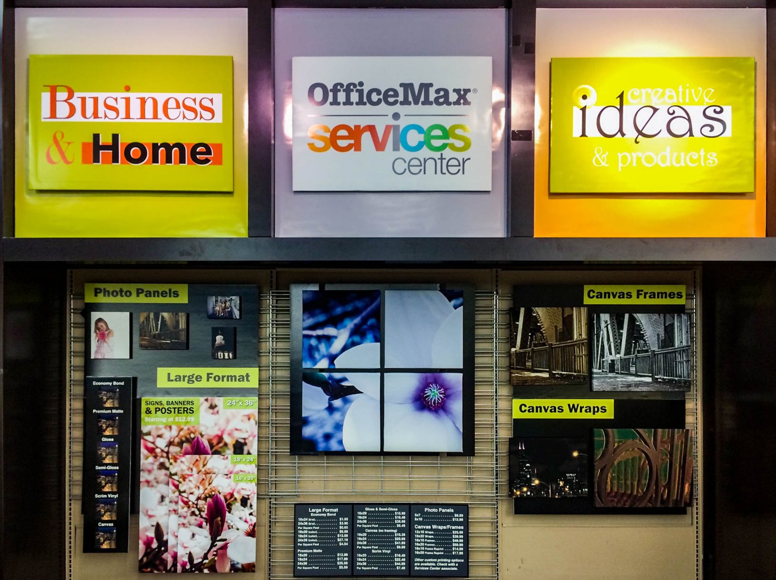 The upper squares were designed to draw attention to the printing department from across the store. The lower area was designed to support a number of different types of printed samples. Both were designed to be easily updated with new content when necessary by using hook and loop fasteners (Velcro). Simple spacing templates were created to ensure consistent and accurate placement of the square Velcro pieces.